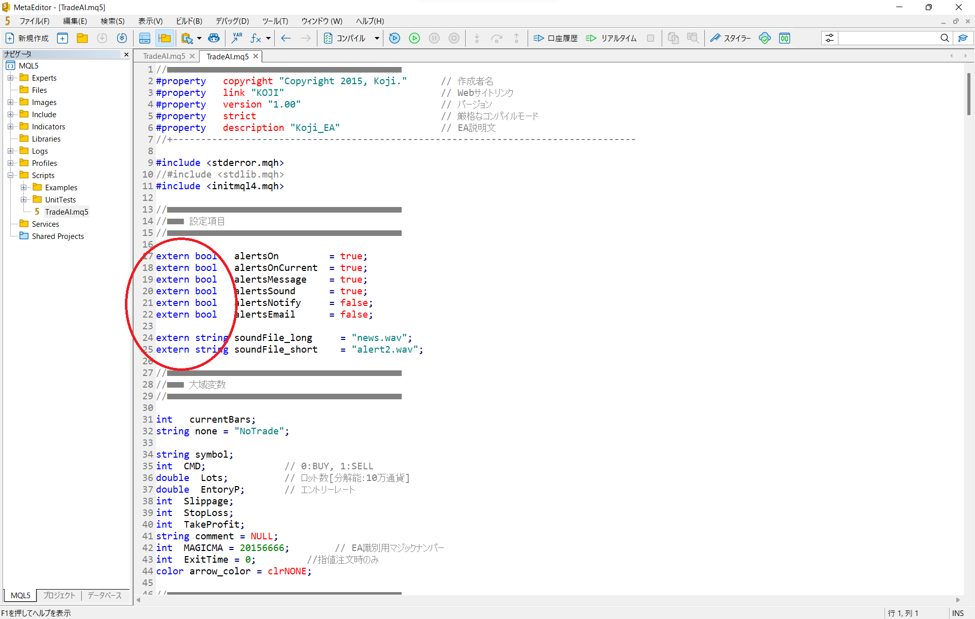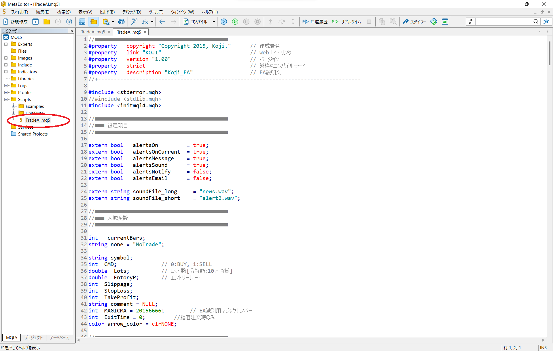 ナビゲーターのscriptsからTradeAI.mql5を開く。