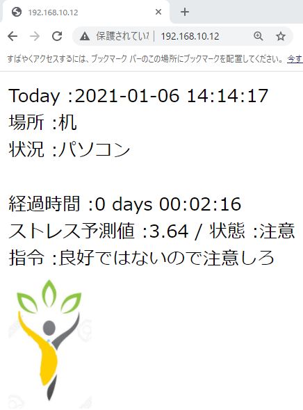 | html | Today | 場所 | 状況 | 経過時間 | ストレス予測値 | 状態 | 指令 | 画像 |