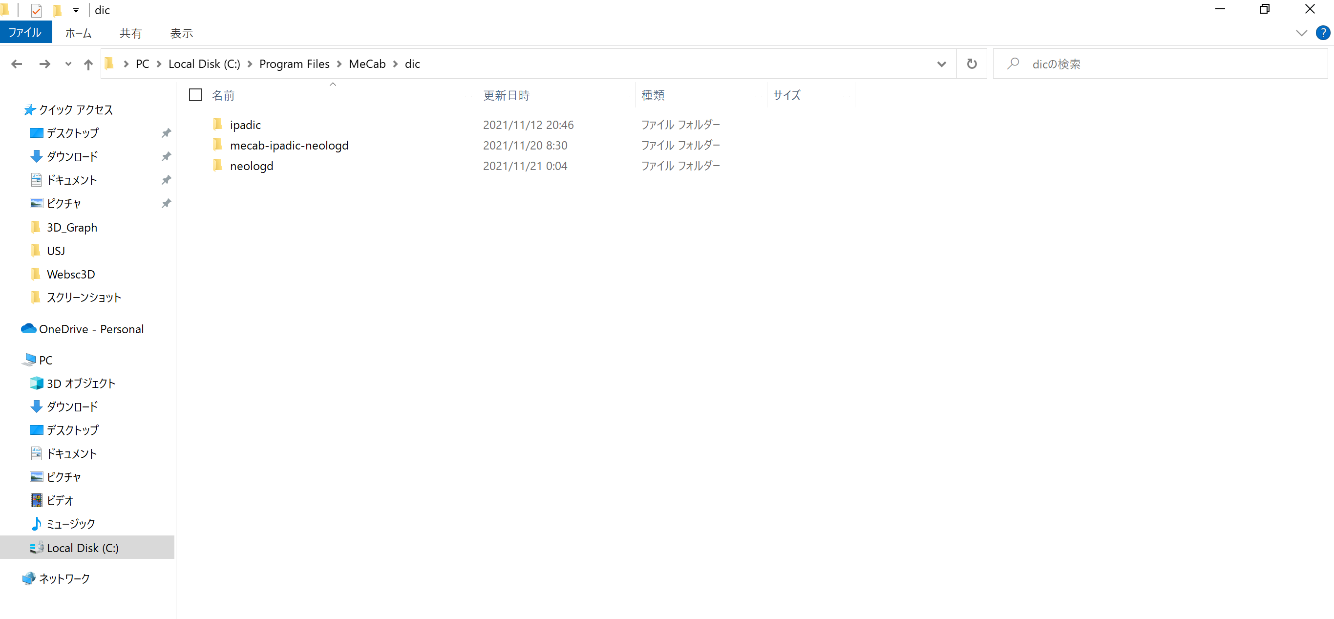 neologd.zipを解凍した後、中身のmecab-ipadic-neologdをdicのフォルダにコピーする