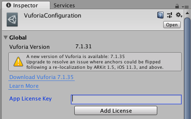 Inspectorタブを選択し,XR Settings の Vuforia Augmented Reality Supported にチェックを入れる.
