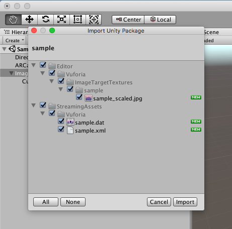 4. Databaseのパッケージ化 先ほどTargetを登録したDatabaseの画面で,取り込みたいマーカーの左側にチェックを付けて,「Download Database(xx)」ボタン(xxはチェックを入れたTargetの数)をクリック. すると,プラットフォームを聞かれるので「Unity Editor」を指定する. 最後に「Download」ボタンをクリックすると,パッケージ化されたDatabaseがダウンロードできる.