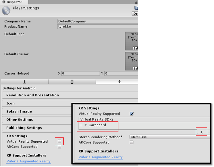 Androidタブを選択後,「XR Settings」内の「Virtual Reality Supported」にチェックを入れる.