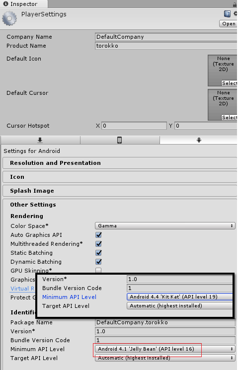 その後,下のPlayer Settingsをクリックすると,Unityエディターの右側の「Inspector」が「PlayerSettings」に切り替わる.その中のAndroidタブを選択し,「Other Setttings]内の設定を以下のように変更する.