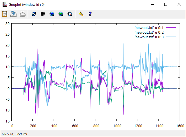 そのままのプログラムでは、コマンドプロンプトに、スマホの加速度がx軸、y軸、z軸の順に半角スペース1つ分あけて表示される。
