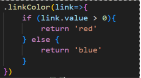 linkColor メソッドは、各リンクに対して色を決定するための関数を引数として受け取る。 link パラメータは、各リンクの情報を含んでおり、例えば link.value はそのリンクの値を示している。 関数内の条件文では、link.value の値に基づいてリンクの色を決定している。ここでは、link.value が 0 より大きい場合は 'red'(赤)、そうでない場合は 'blue'(青)を返している。