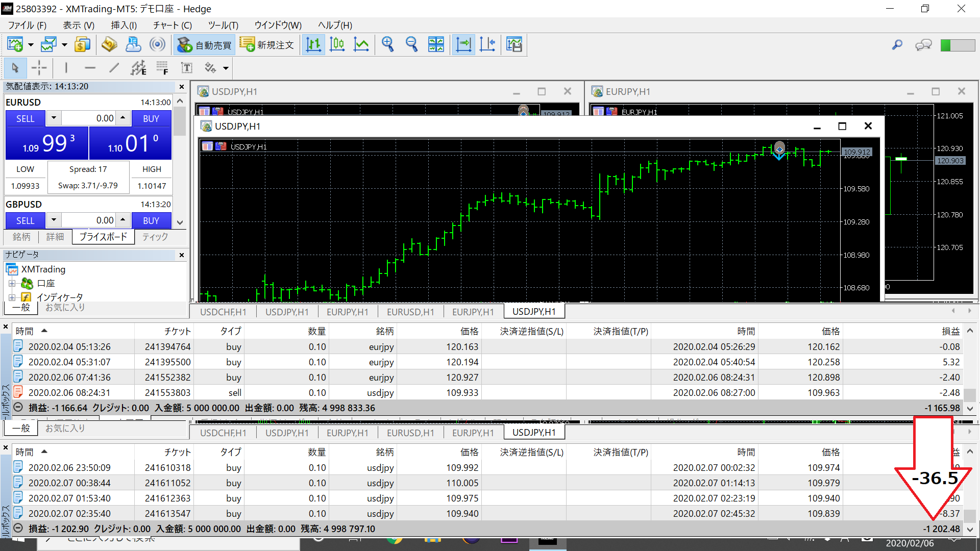 期間:2020.02.05 17:19 ~20:30 (3時間10分) 結果:-130.33 (損失)