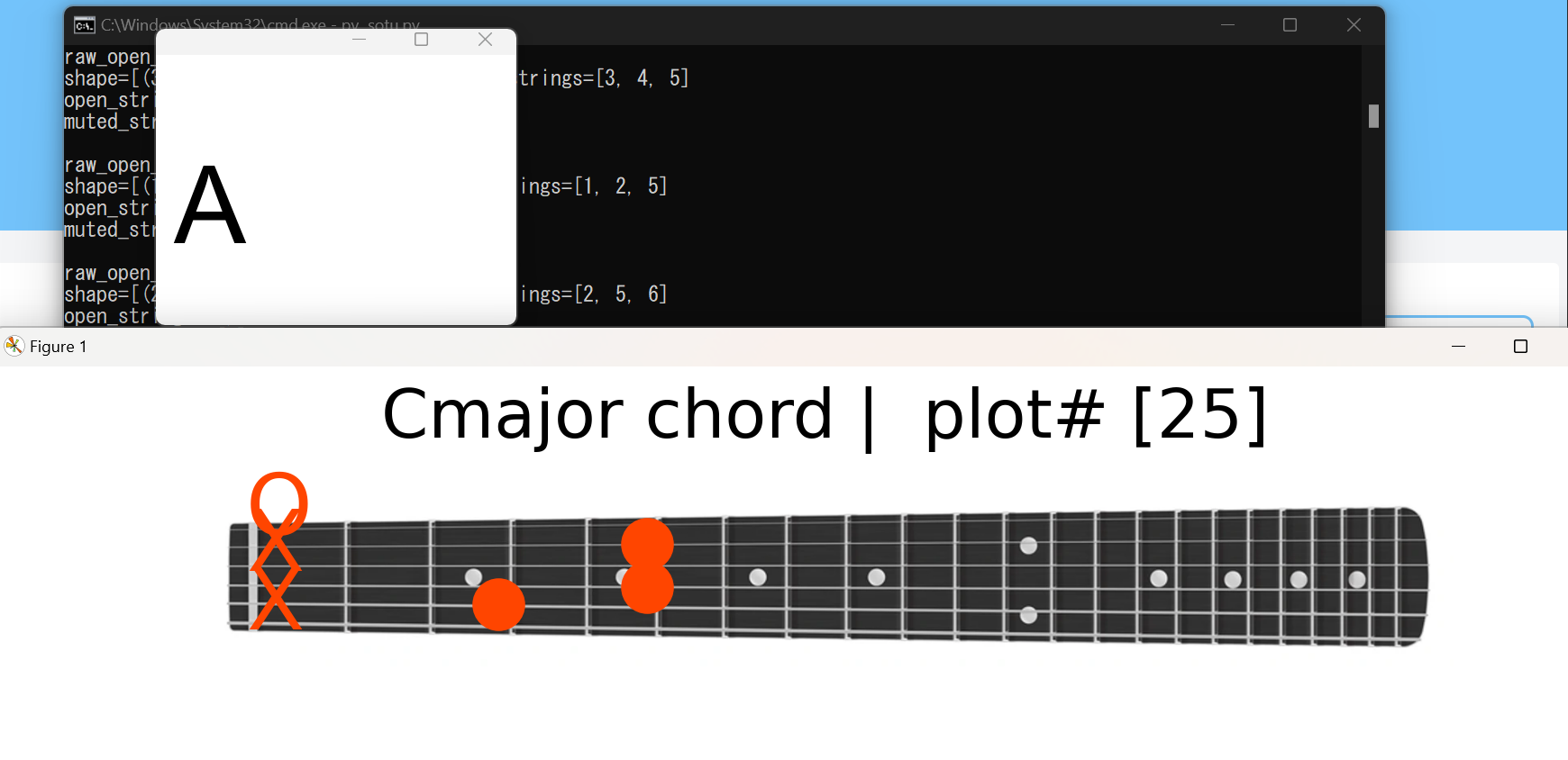 2. 判定された音高に合わせ,ギターの指版に抑える場所を〇や×で示したコード譜を作成して画像としてプロットする.
