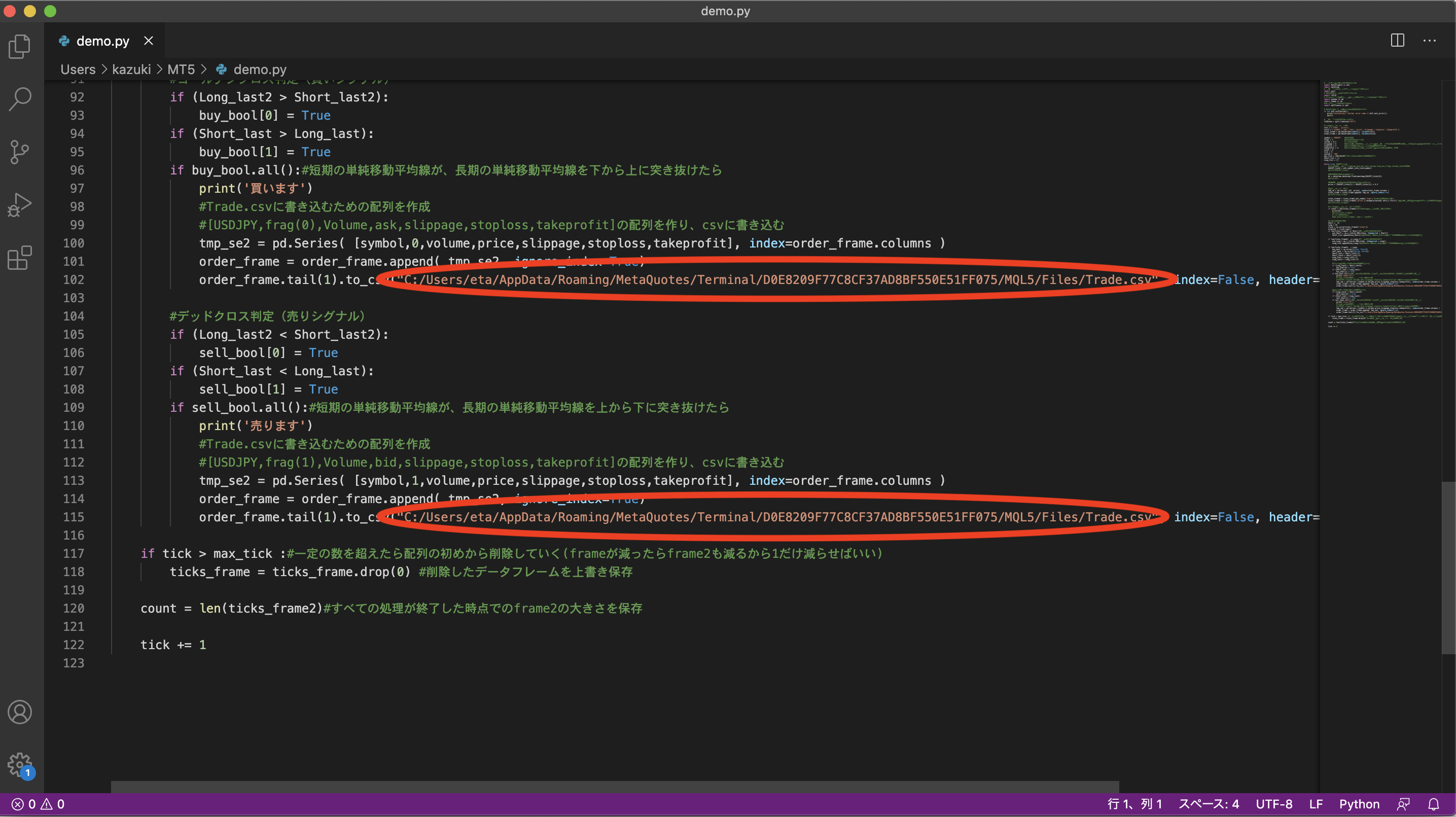 次にpythonのdemo.pyをテキストエディタなどで開き、Trade.csvのディレクトリを書き換える。