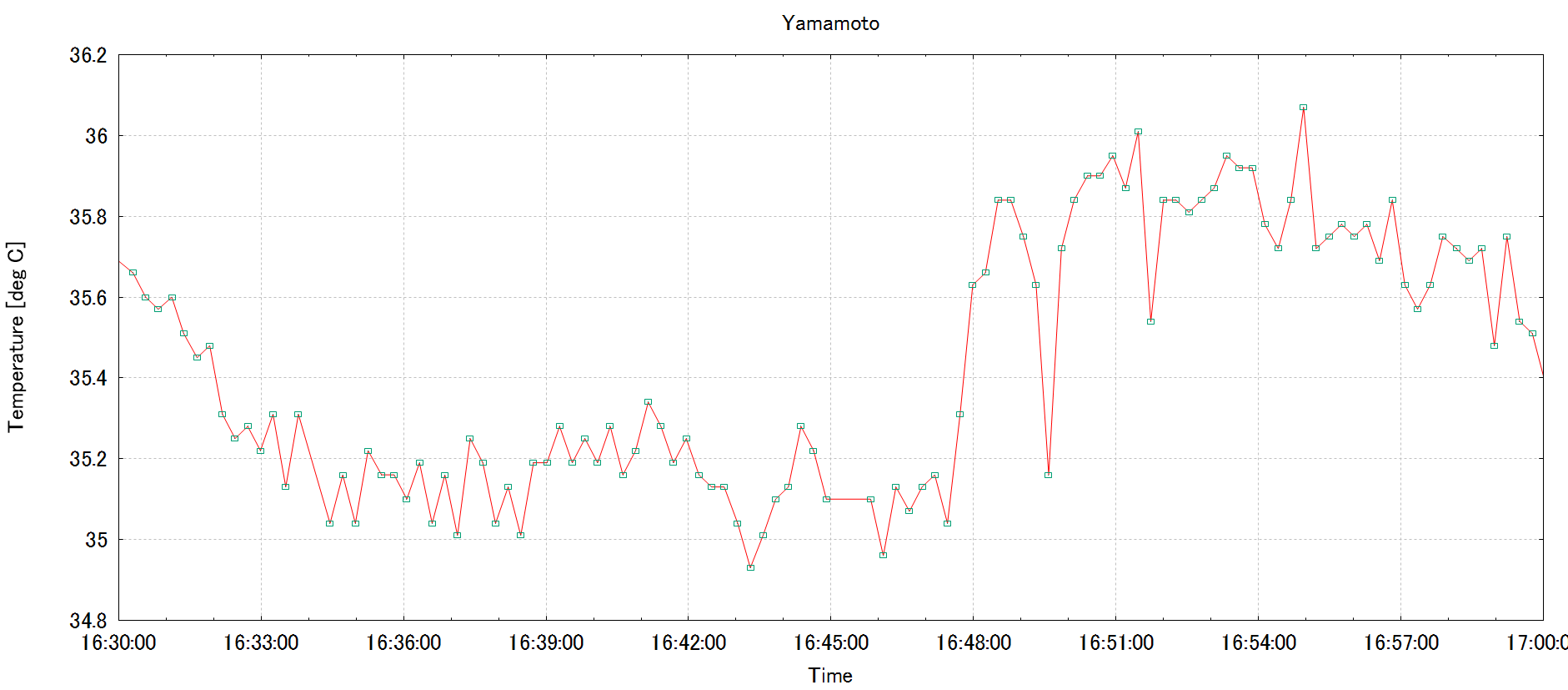 set xdata time set timefmt "%H:%M:%S" set xrange ["16:30:00":"17:00:00"] set grid set xlabel 'Time' set ylabel 'Temperature [deg C]' set title 'Yamamoto' p "data.txt" u 2:3 w l lc rgb "#FF0000" notitle,"data.txt" u 2:3 w p pt 4 ps 0.5 notitle