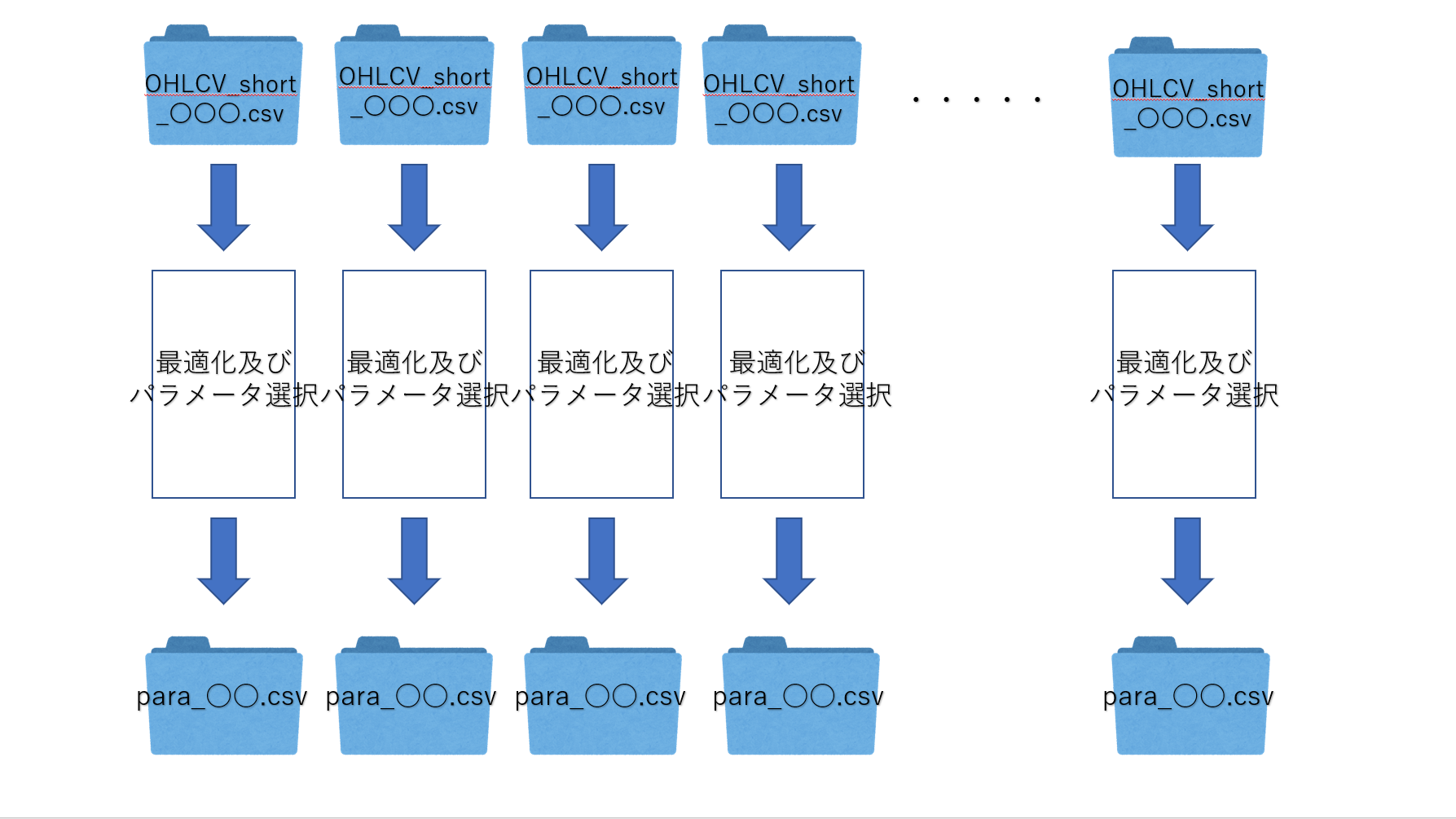 各インジケーターの最適化プログラム(indi_@@@.py)の流れは以下のようになっている.