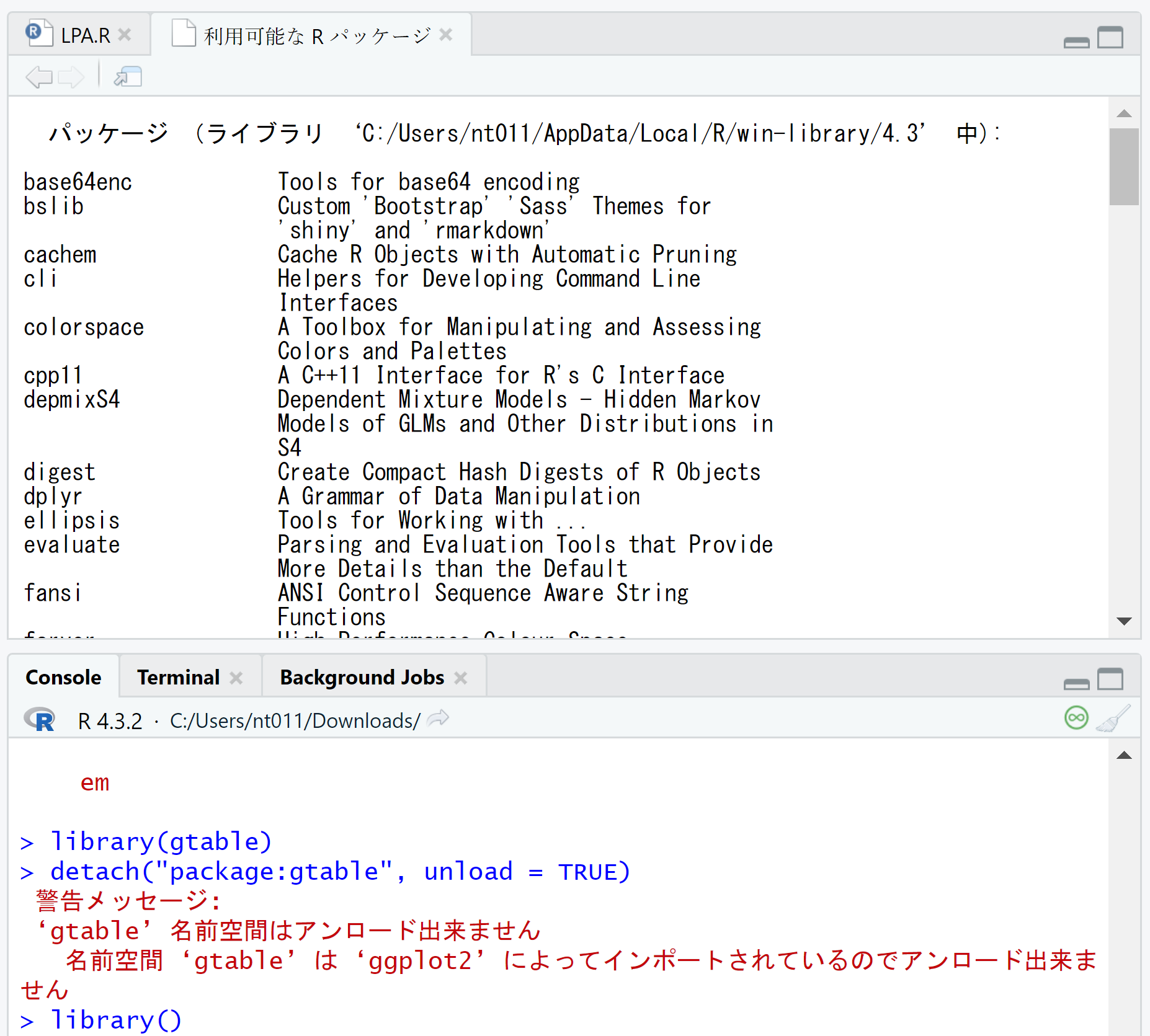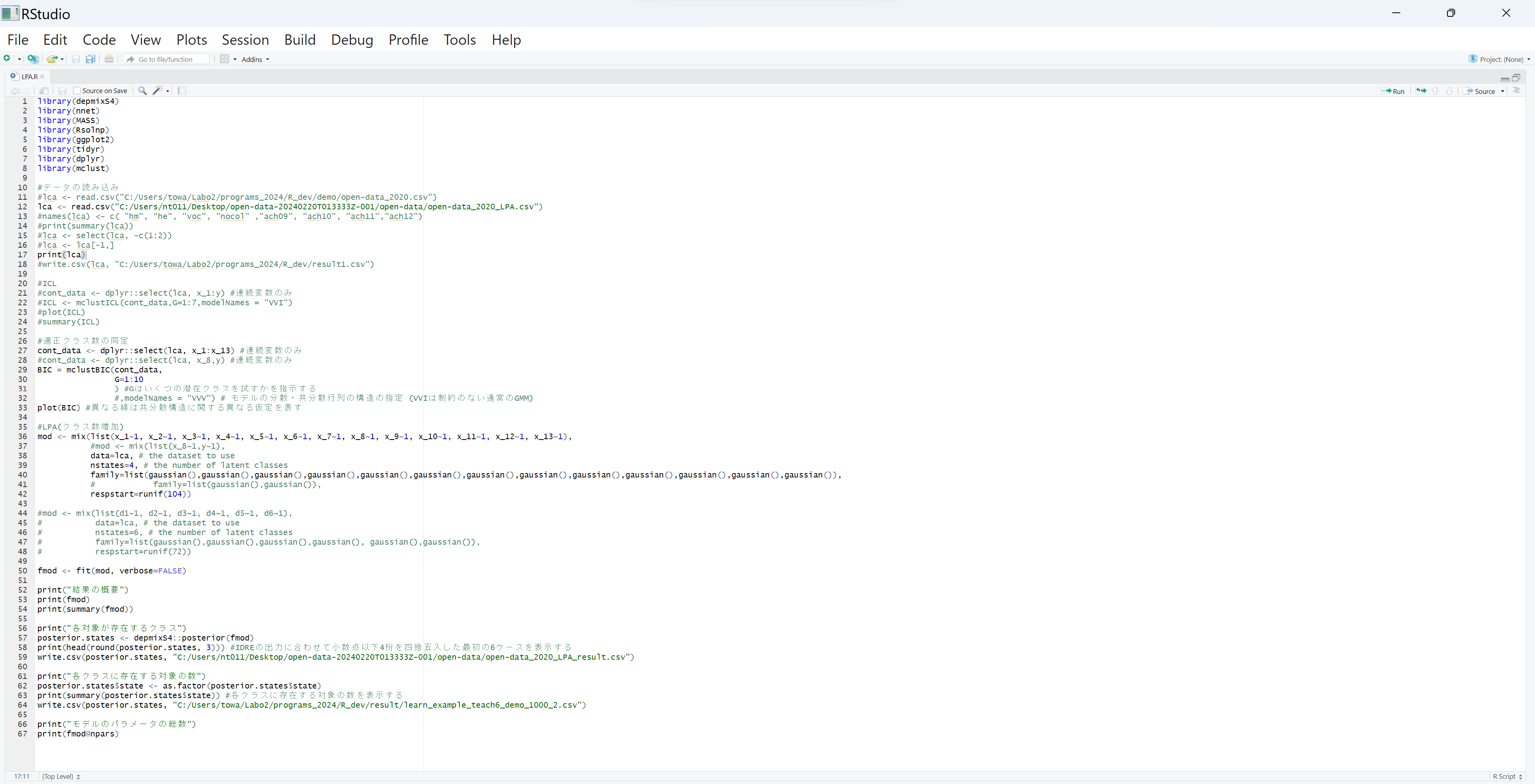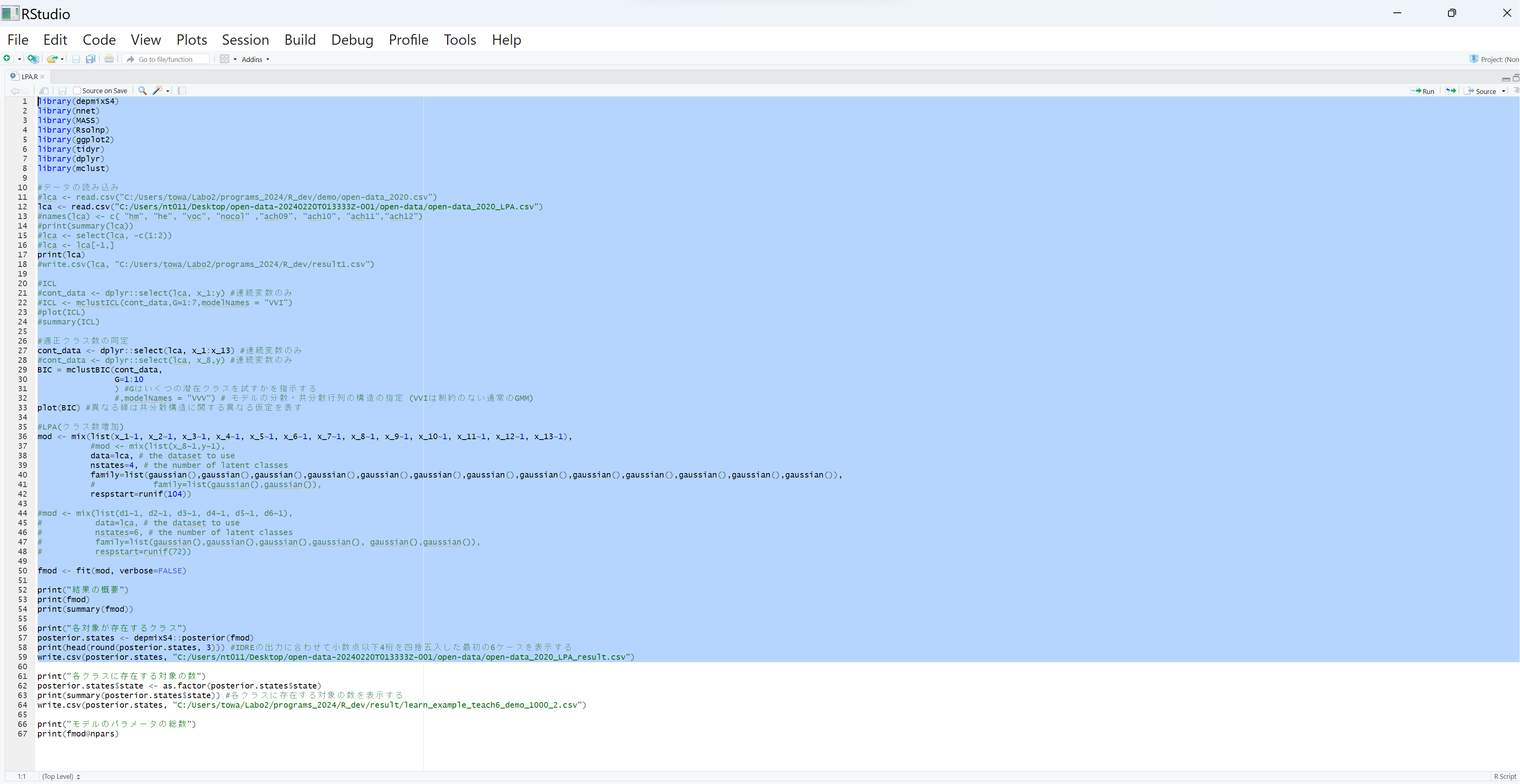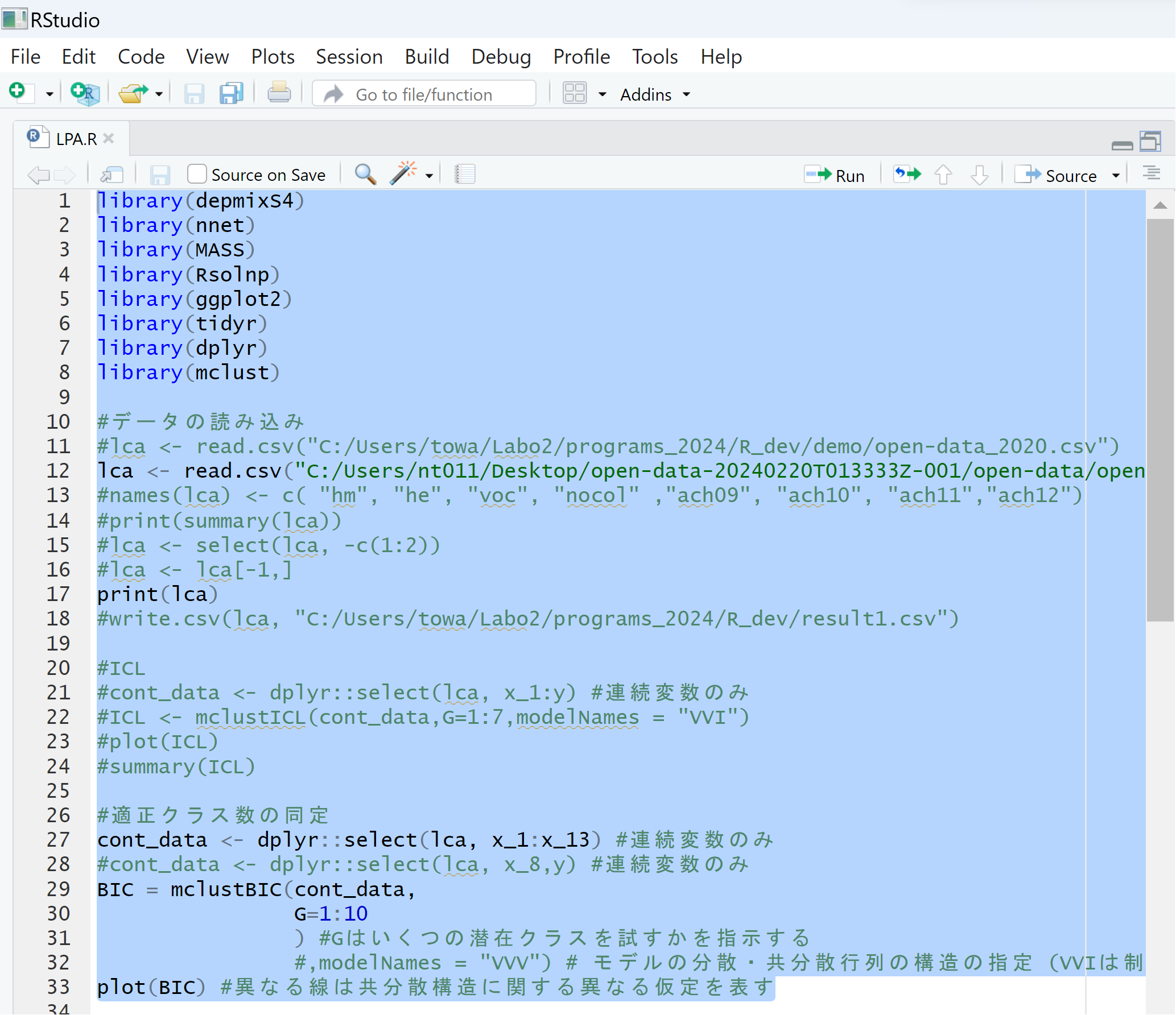 これはLPA.Rを先ほどダウンロードしたRstudio上で行う.