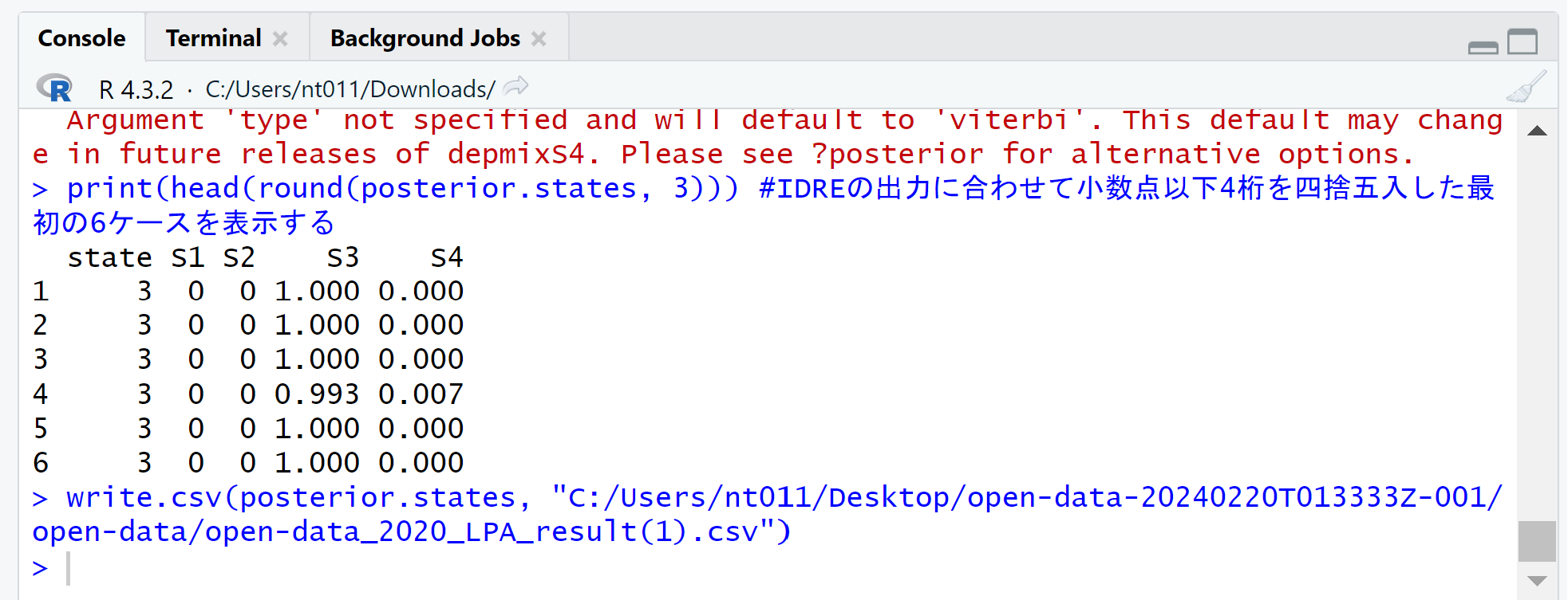 write.csv(posterior.states, "C:/Users/towa/Labo2/数値実験結果/オープンデータを用いたLPA/2020/data_2020/LPA_0209/open-data_2020_LPA_result.csv")
