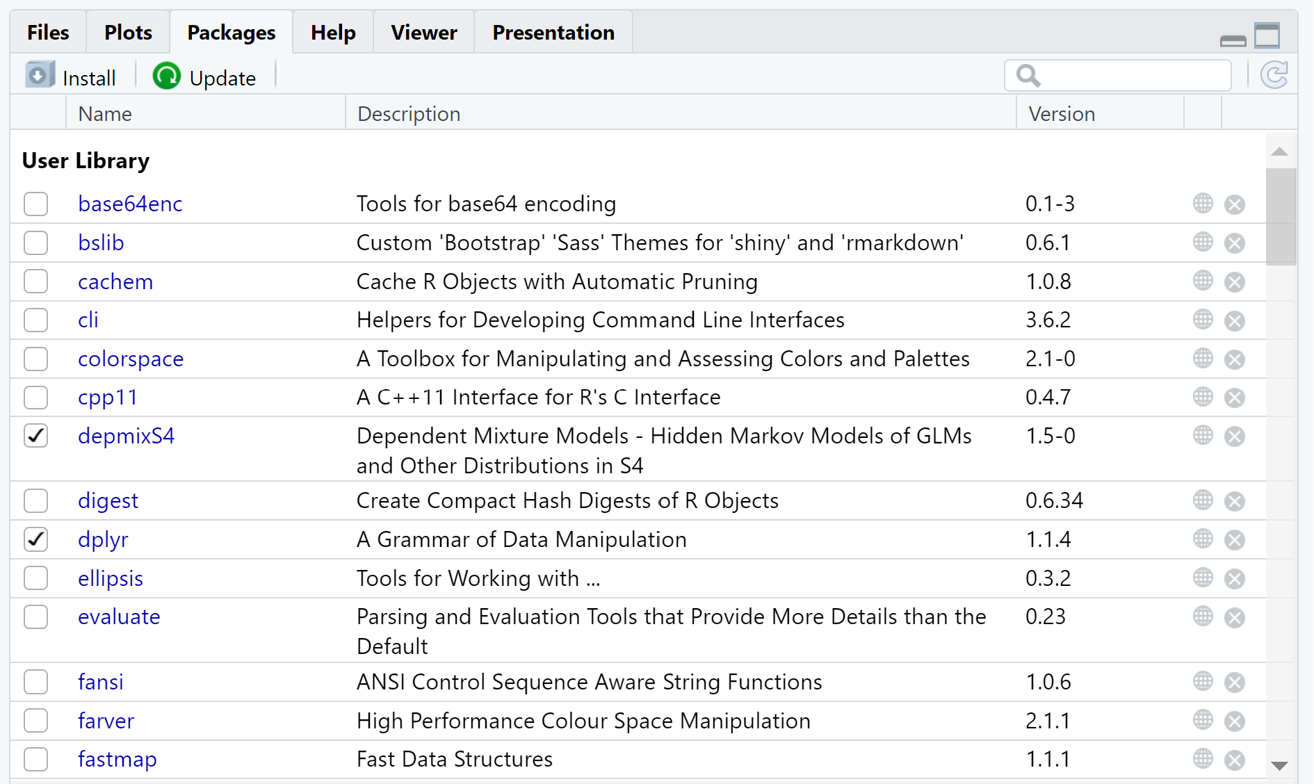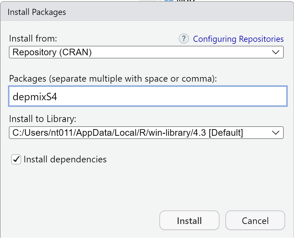 左上のInstallを押すと,好きなPackagesをインストールすることが出来る.(今回はdepmix4)