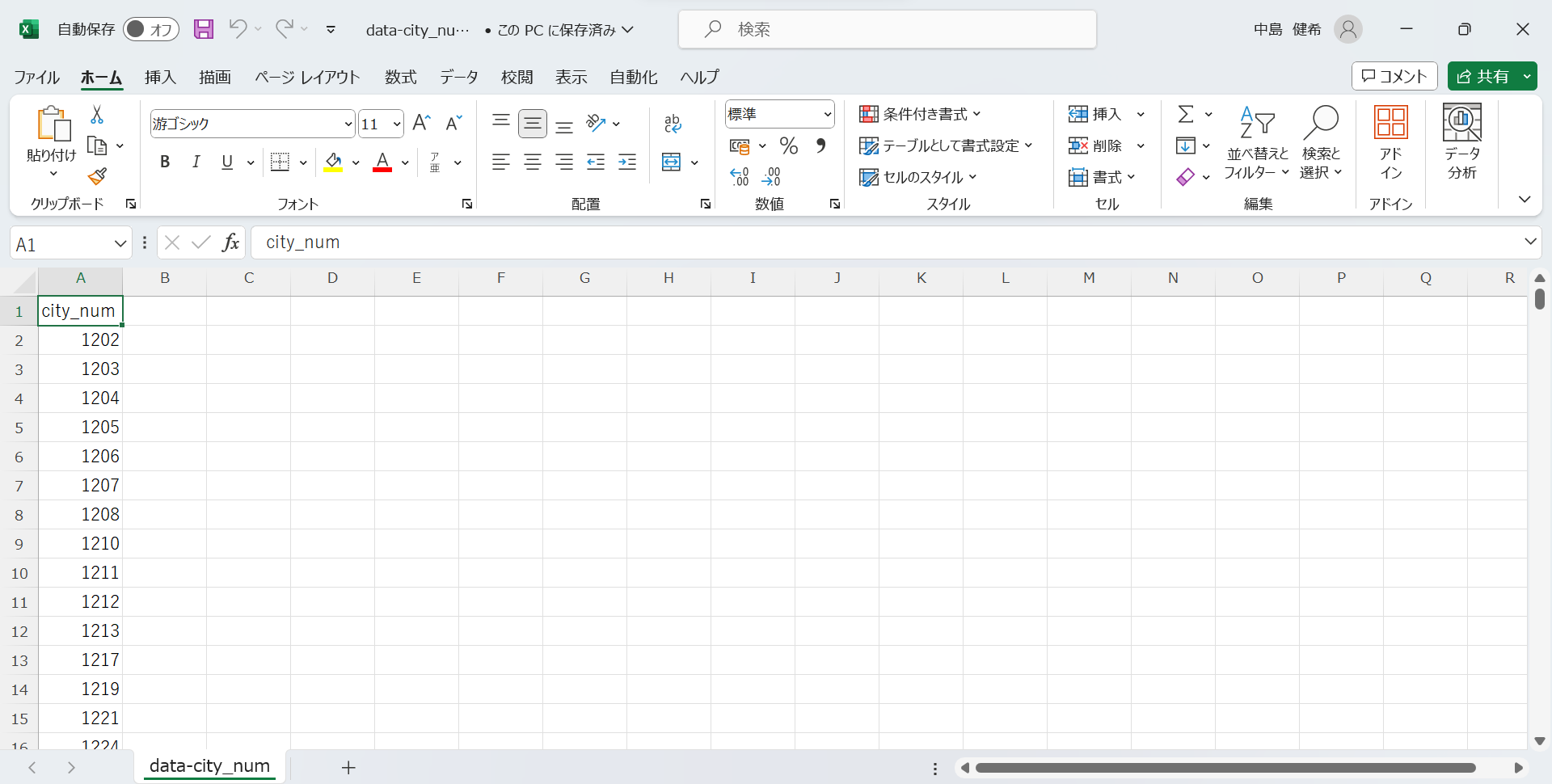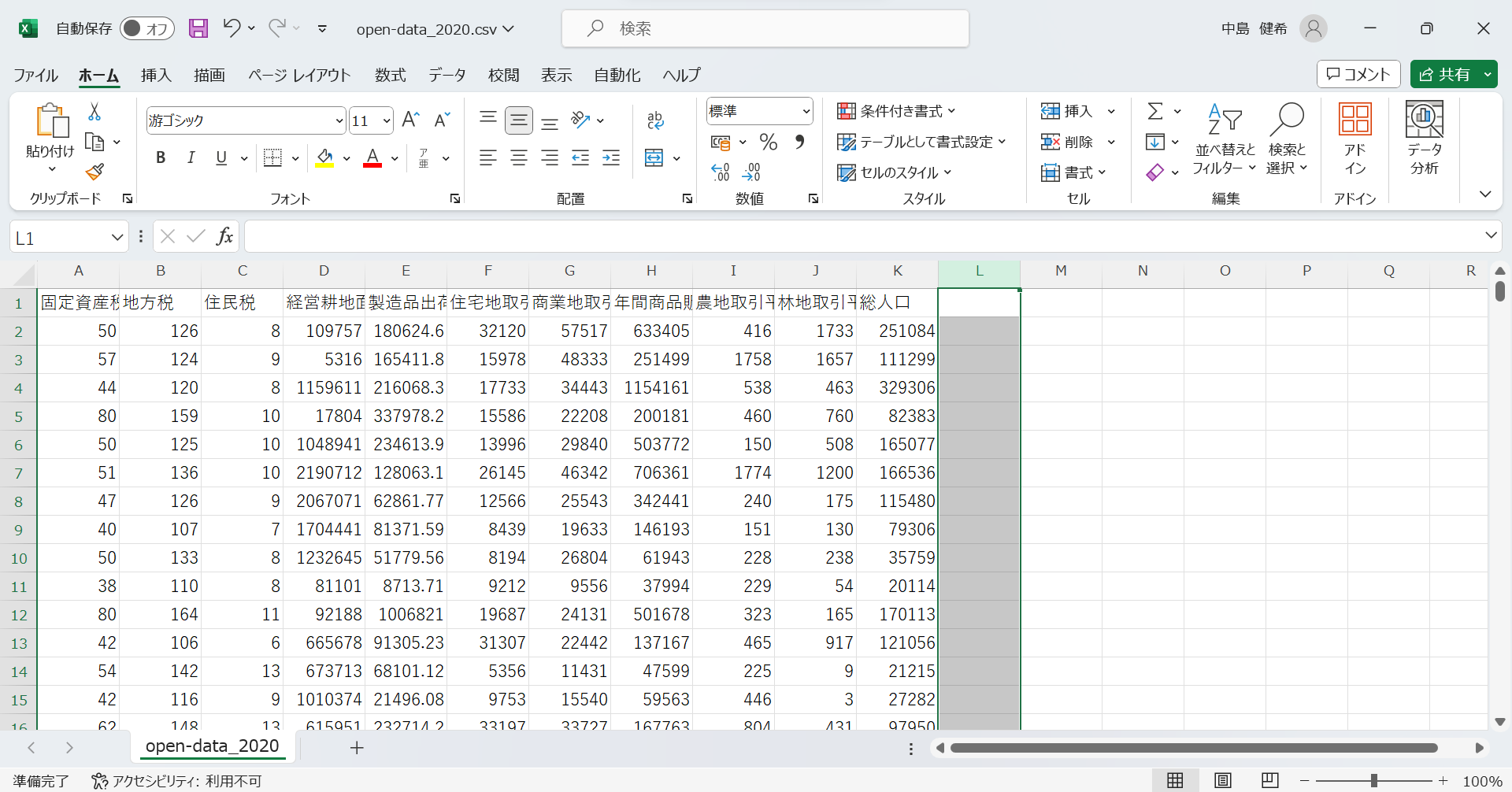 ダウンロードしたopen-data-20240220T010622Z-001の中にあるopen-data_2020.csvに集めた2つのデータを元あるデータの右に貼り付ける. その際に,1741のデータから651のデータを抜き取ること.どのデータを入れるかはdata-city_num.csvを見て行う.(市町村コードが対応するデータを取る.)