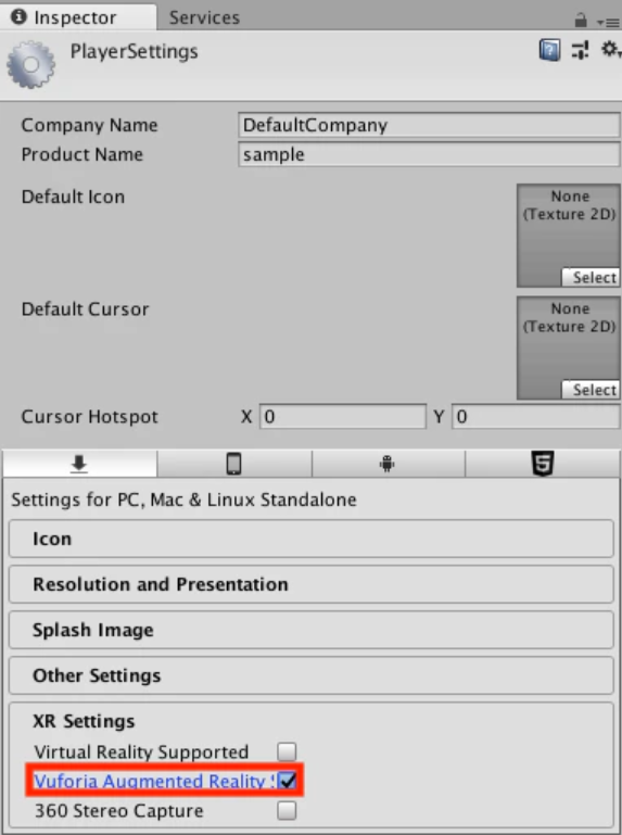 [Edit > Priject Settings > Player]を選択し、Inspectorタブの、XR SettingsのVuforia Augmented Reality Supported にチェックを入れる