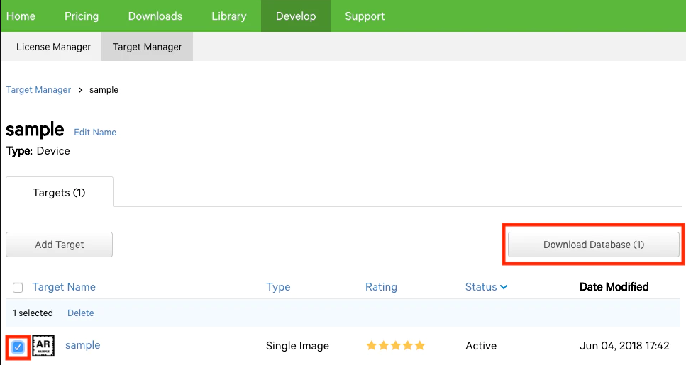 Develop > Target Manager > Add Database から、マーカーを管理するDatabaseを作成。テキトー(学籍番号とか)に名前を付け、デバイスにお設定しておく