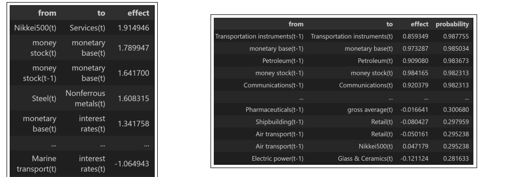 得られた因果性は上のような形式で保存される. fromには影響を与えている要素,toには影響を与えられている要素,valueには因果性の大きさが格納されている. 一行ずつ因果の向きと大きさが格納されている