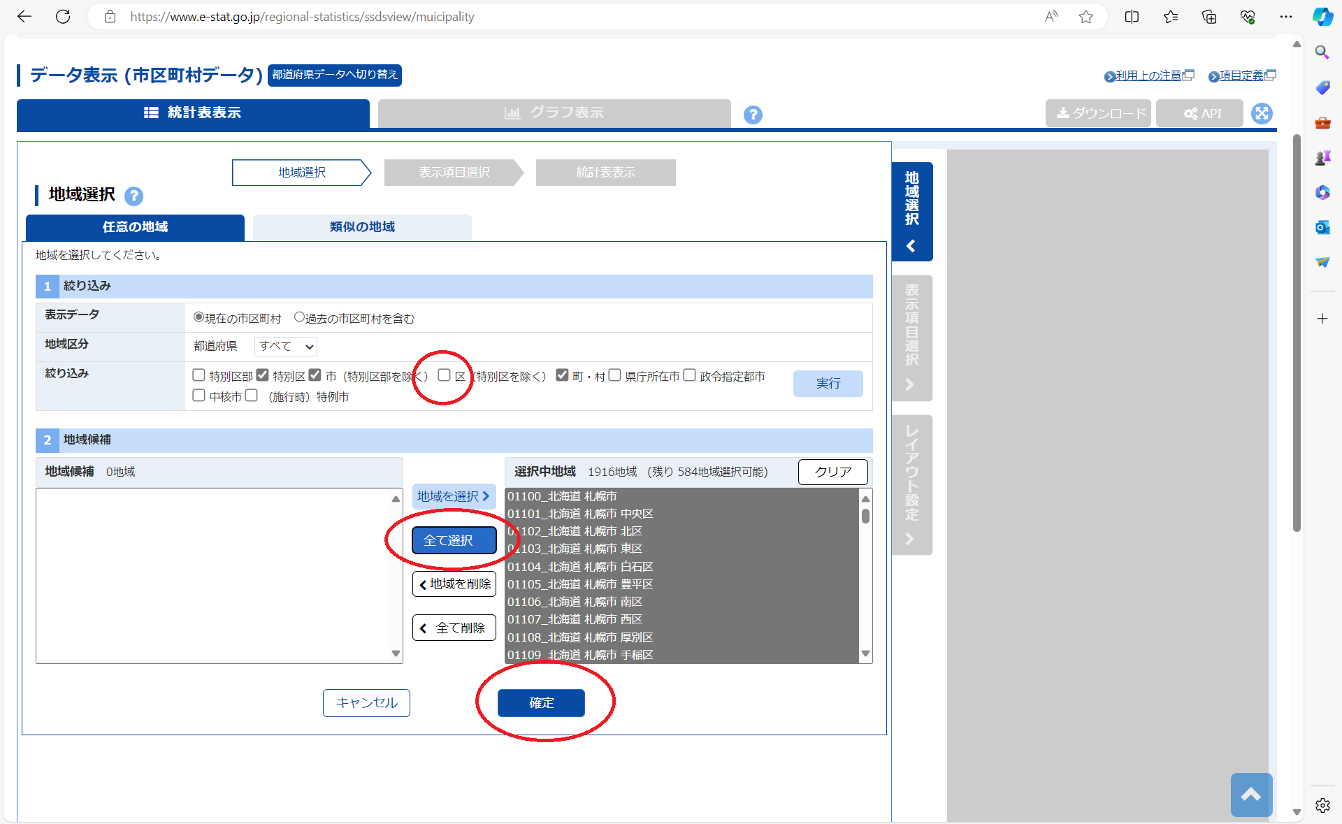 絞り込みで「区」を外し、地域候補は「全て選択」をクリックし確定