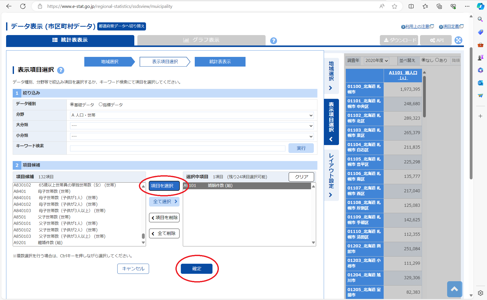 項目候補の中から欲しいデータを選択し「項目を選択」をクリックし確定