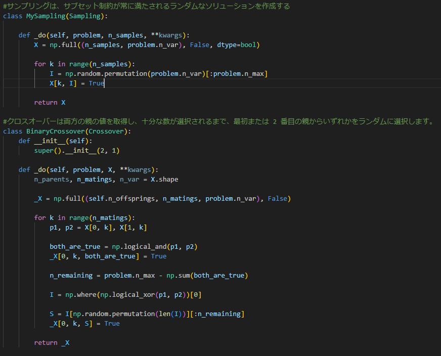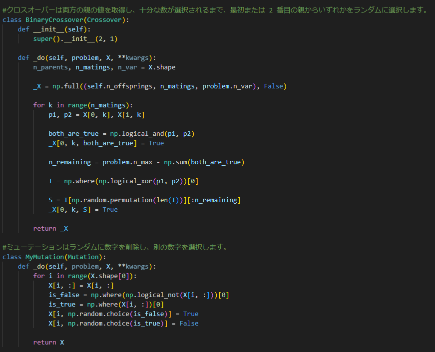 2行目から26行目まで の範囲で、予測確率を -prob_q1 などの形で代入(負の値ににしているのは、NSGA-Ⅱでは二変数の最小化を行うため)。