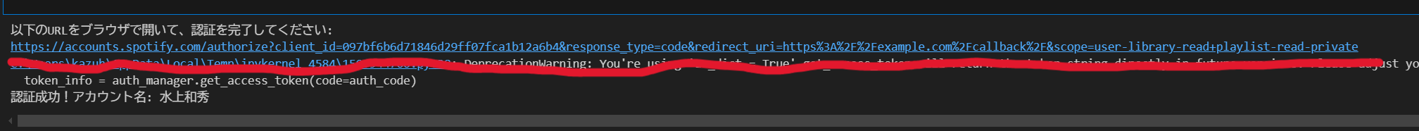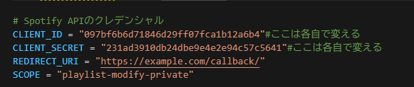 これは、次の「プレイリストの作成とhtmlの作成」を実行するために必要なコードである。 まず、「CLIENT_ID」と「CLIENT_SECRET」は「下準備2」で取得したものを入れる