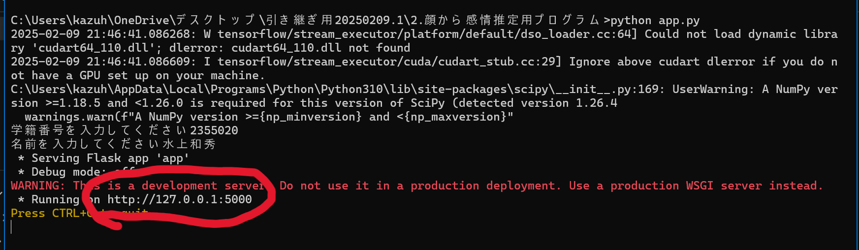 6.「2.顔から感情推定用プログラム」のapp.pyをコマンドプロンプトから起動
