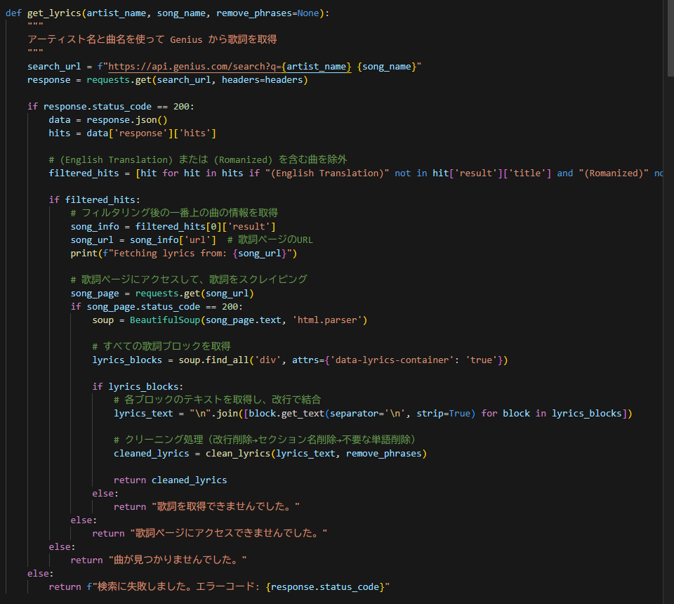 「get_lyrics」はアーティスト名と曲名を使って Genius から歌詞を取得する関数。