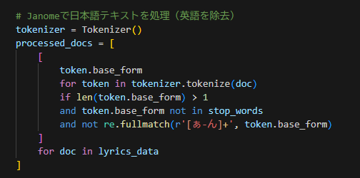最後に、歌詞のごみとり処理を行った結果結果が「data」の「4.歌詞付き楽曲特徴量.csv」に保存される。