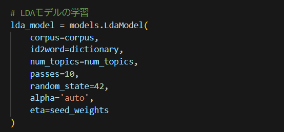 ここはLDAモデルのパラメータ設定部分。etaはトピックの単語分布を表し、さっき作成した単語分布を使用している