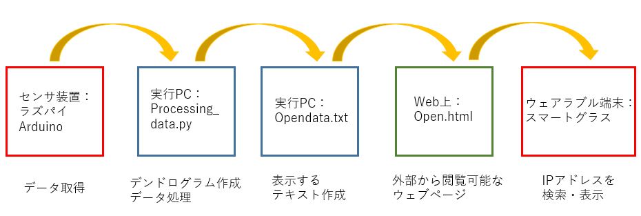 流れはcsvファイルを編集するコード(py),表示されるウェブページ(html),MOVERRIO(グラス)の順で表示する