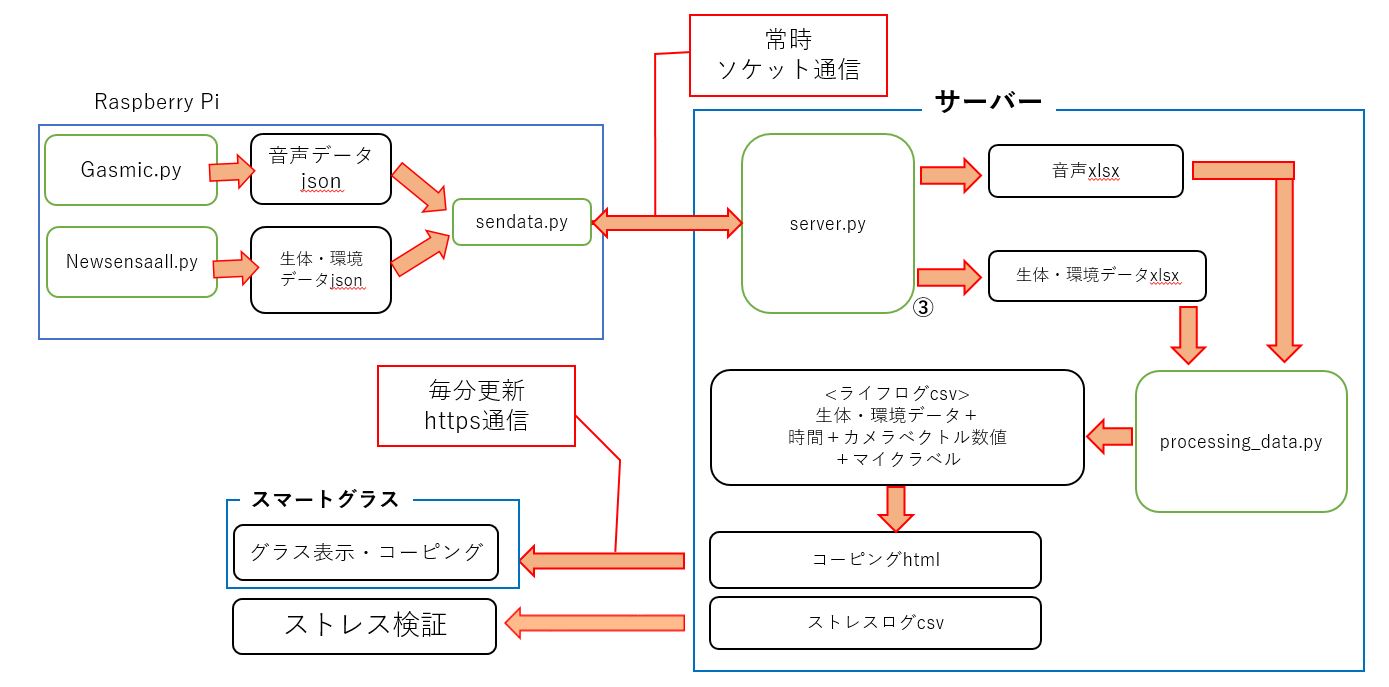 1.newsensa_all.pyでマイク以外のセンサデータを30秒毎取得しjsonファイルを作成、gasmic.pyで音声データを任意のタイミングで取得しjsonファイルを作成