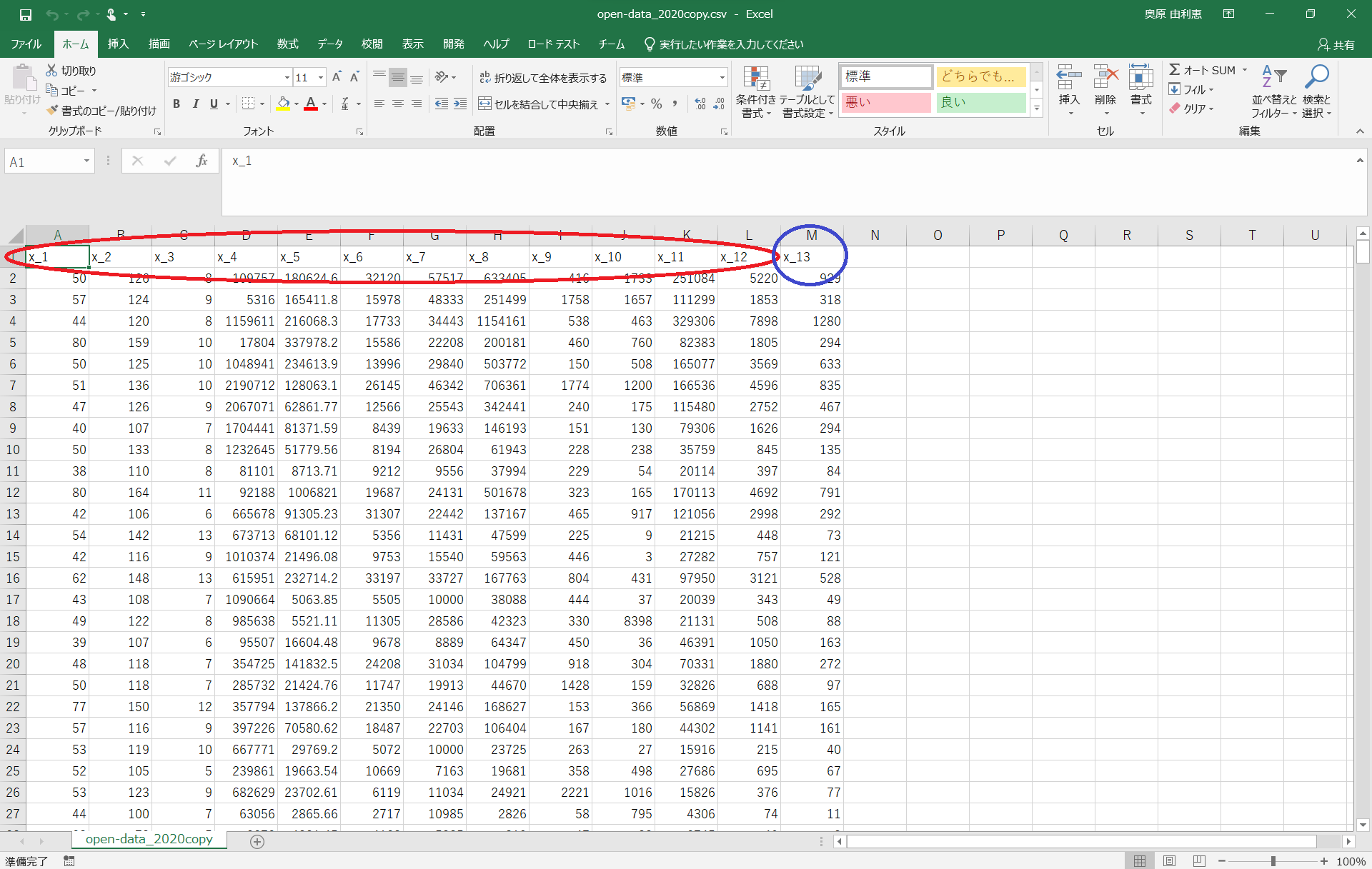 open-data_2020copy.csvの1行目を画像のようにx_1からx_○と書き換える(x_1とかの書き方じゃなくてもいい)