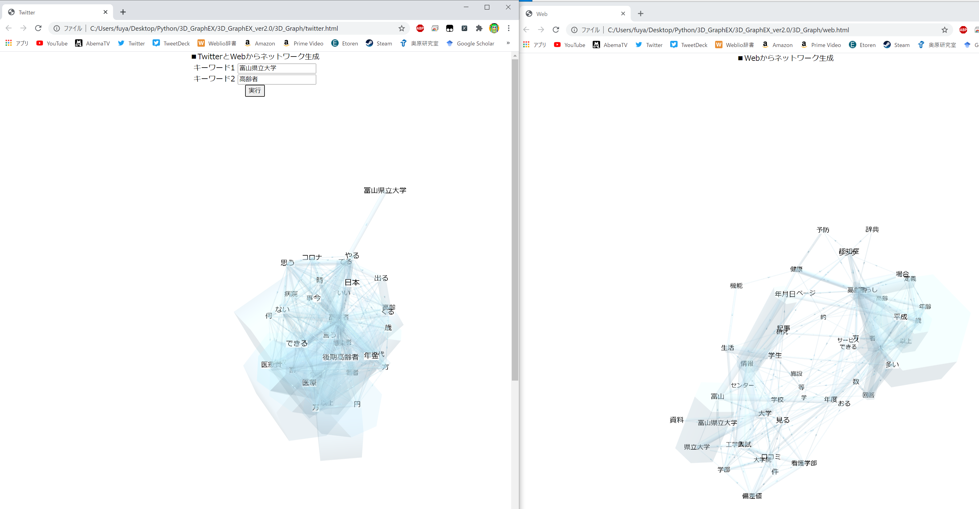 キーワードを2つ入力してWebとTwitterから共起ネットワークを作成するもの