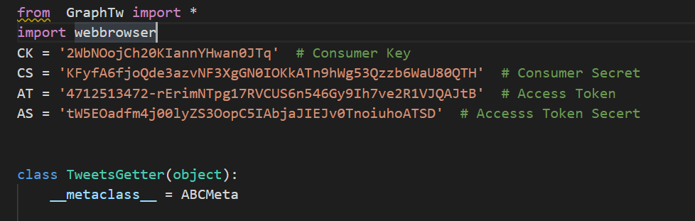 TwitterAPIのアクセスキーなどが現状のままだと平松のになっているので各自で取得して変更する必要がある。~TwitterAPIに関しては参考資料の欄に書いてある