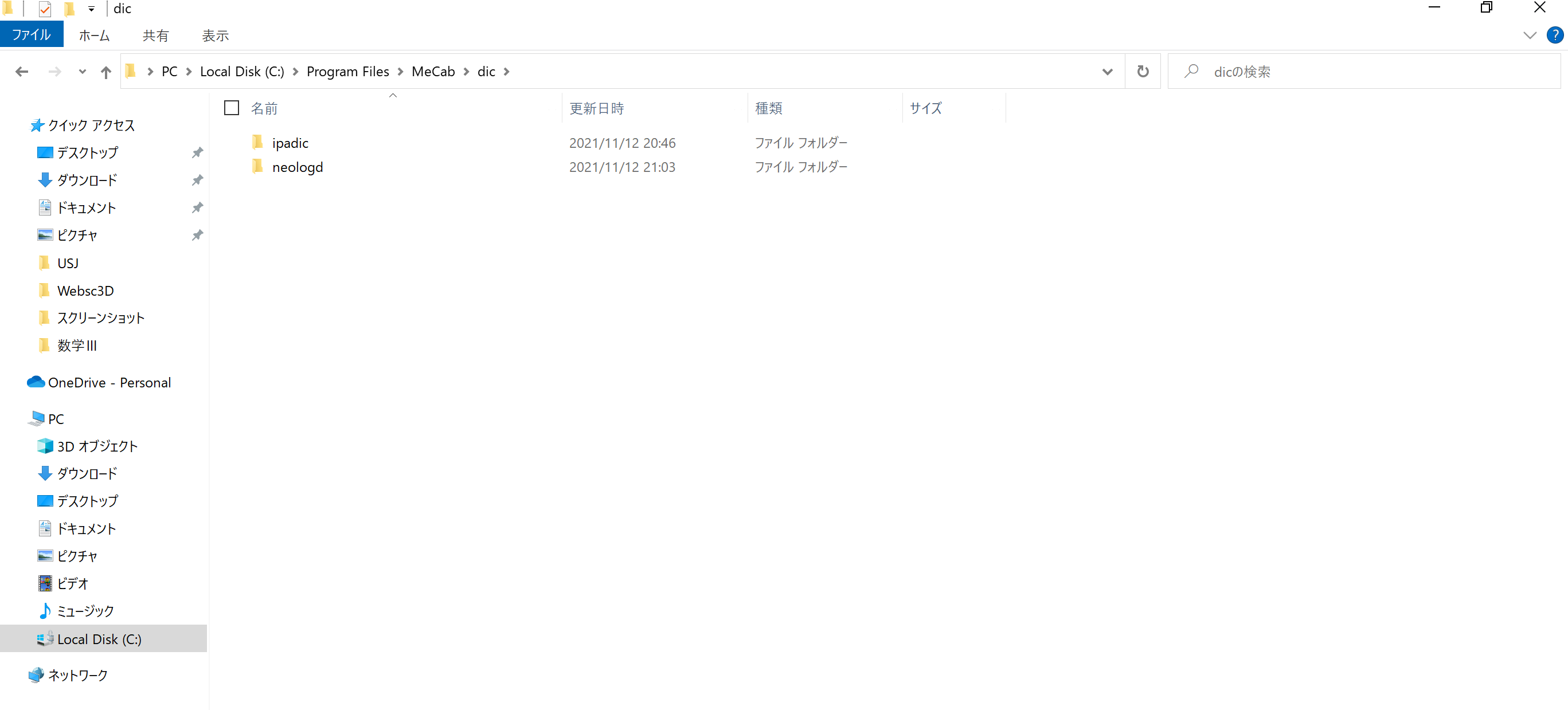 ipadicの中身を全部コピーしたフォルダipadic-UTF8と中身のないフォルダneologdを作成する