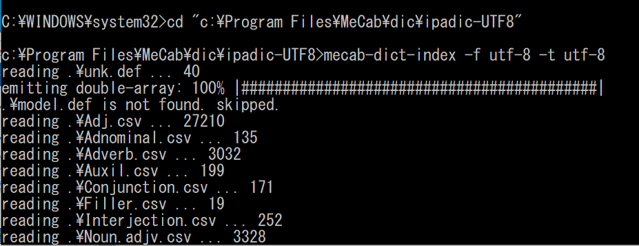 管理者権限でコマンドプロンプトを起動し,ipadic-UTF8のディレクトリに移動し,ipadicの中身をUTF8に変換する