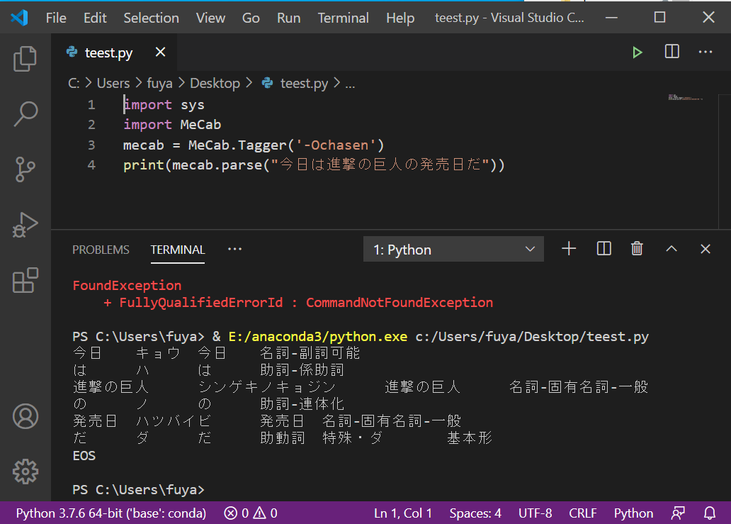 ※上記リンク先のanacondaのインストールはスキップ ※python3.8の場合、上記リンクのpip install mecab-python-windowsではなくpip install mecabだとできる