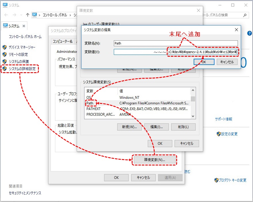 ・このコードは、raspberry pi内のdht11_example.pyを温度の数字のみを表示するように変更すると使える。#if _DEBUG #pragma comment(lib, "opencv_calib3d2411d.lib") #pragma comment(lib, "opencv_contrib2411d.lib") #pragma comment(lib, "opencv_core2411d.lib") #pragma comment(lib, "opencv_features2d2411d.lib") #pragma comment(lib, "opencv_flann2411d.lib") #pragma comment(lib, "opencv_gpu2411d.lib") #pragma comment(lib, "opencv_highgui2411d.lib") #pragma comment(lib, "opencv_imgproc2411d.lib") #pragma comment(lib, "opencv_legacy2411d.lib") #pragma comment(lib, "opencv_ml2411d.lib") #pragma comment(lib, "opencv_nonfree2411d.lib") #pragma comment(lib, "opencv_objdetect2411d.lib") #pragma comment(lib, "opencv_ocl2411d.lib") #pragma comment(lib, "opencv_photo2411d.lib") #pragma comment(lib, "opencv_stitching2411d.lib") #pragma comment(lib, "opencv_superres2411d.lib") #pragma comment(lib, "opencv_ts2411d.lib") #pragma comment(lib, "opencv_video2411d.lib") #pragma comment(lib, "opencv_videostab2411d.lib") #else #pragma comment(lib, "opencv_calib3d2411.lib") #pragma comment(lib, "opencv_contrib2411.lib") #pragma comment(lib, "opencv_core2411.lib") #pragma comment(lib, "opencv_features2d2411.lib") #pragma comment(lib, "opencv_flann2411.lib") #pragma comment(lib, "opencv_gpu2411.lib") #pragma comment(lib, "opencv_highgui2411.lib") #pragma comment(lib, "opencv_imgproc2411.lib") #pragma comment(lib, "opencv_legacy2411.lib") #pragma comment(lib, "opencv_ml2411.lib") #pragma comment(lib, "opencv_nonfree2411.lib") #pragma comment(lib, "opencv_objdetect2411.lib") #pragma comment(lib, "opencv_ocl2411.lib") #pragma comment(lib, "opencv_photo2411.lib") #pragma comment(lib, "opencv_stitching2411.lib") #pragma comment(lib, "opencv_superres2411.lib") #pragma comment(lib, "opencv_ts2411.lib") #pragma comment(lib, "opencv_video2411.lib") #pragma comment(lib, "opencv_videostab2411.lib") #endif・opencv_lib.hpp作成が終わったら、Windowsの環境変数のpathにOpenCVの動的ライブラリを登録しましょう。