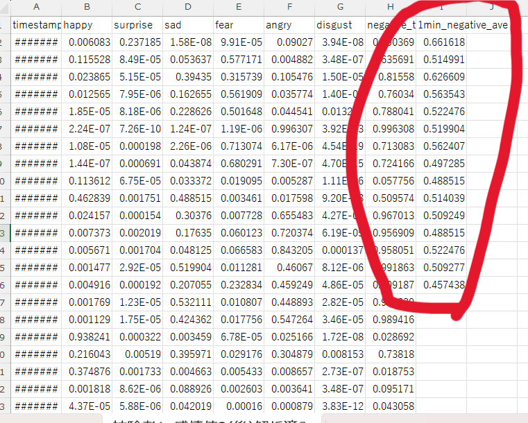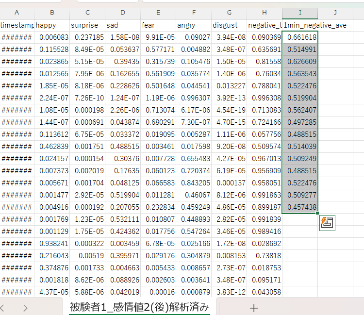 そうすると、選択したcsvファイルに選択した分ごとのネガティブ強度の平均値が表示される。以下は1分ごとの平均値をとった時の出力結果