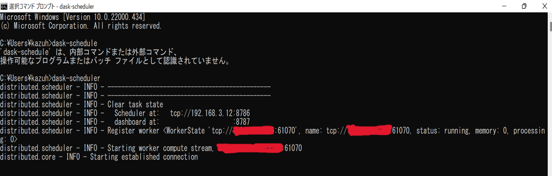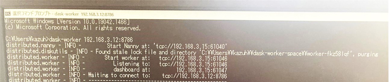 コマンドプロンプトを開いて、「dask-worker {tcp}:8786」と入力する。