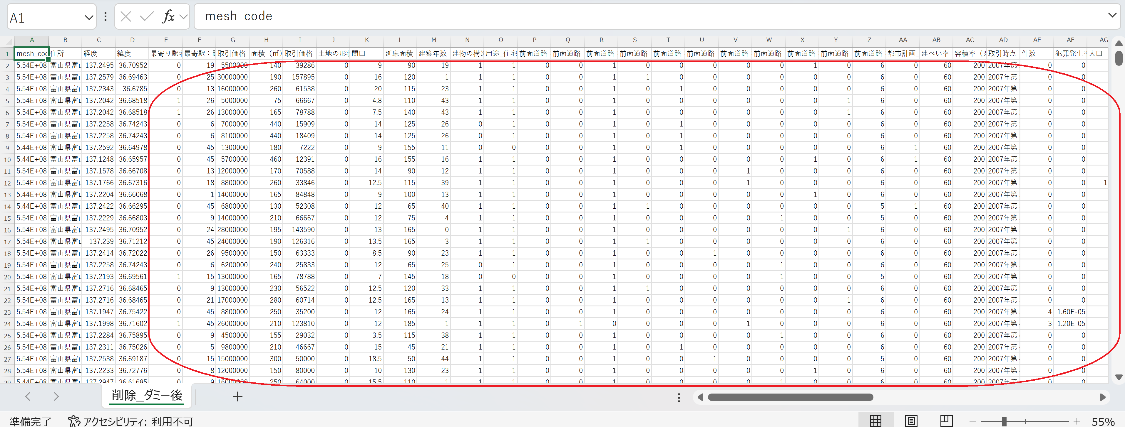 df_result = df_housing[['mesh_code', '住所', '経度', '緯度', '最寄駅:名称', '最寄駅:距離(分)', '取引価格(総額)', '面積(㎡)', '取引価格(㎡単価)',