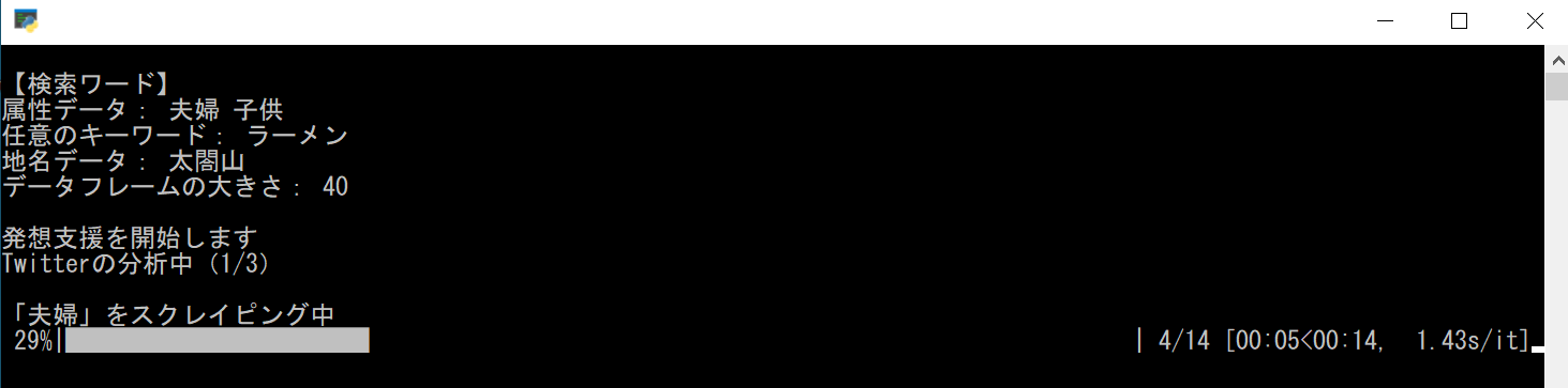テキストマイニングが開始されると新規コマンドプロンプトが自動で起動され,プログラムの進捗状況が表示される.
