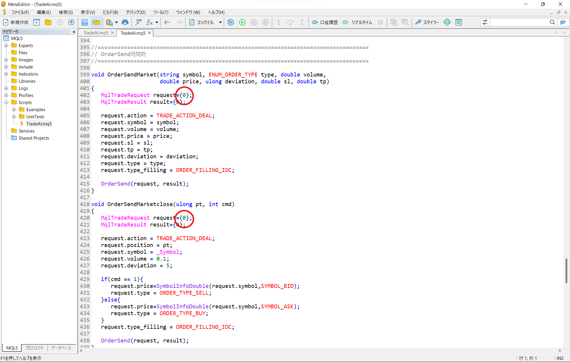 ナビゲーターのscriptsからTradeAI.mql5を開く。