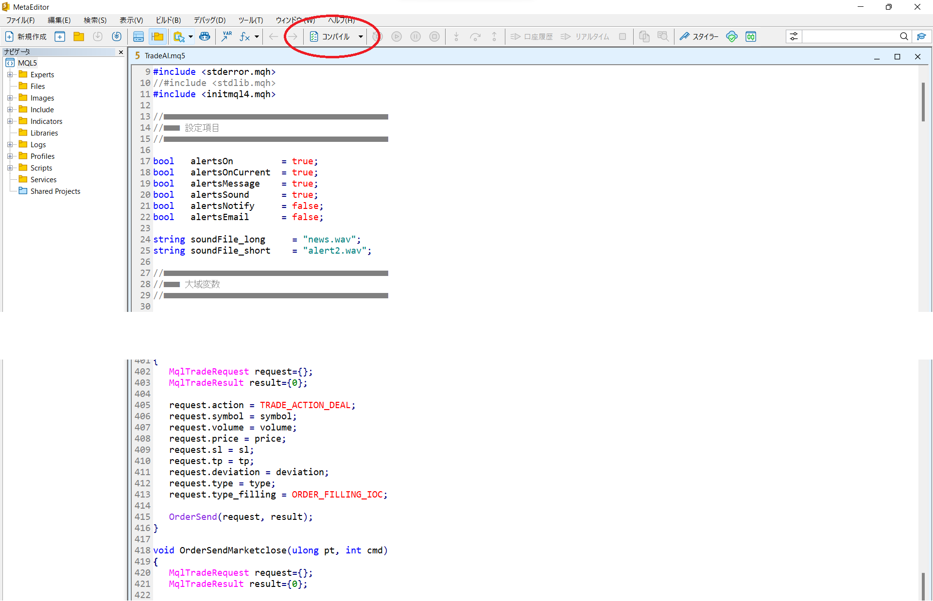 次に、TradeAI.mq5のコンパイルを行う。