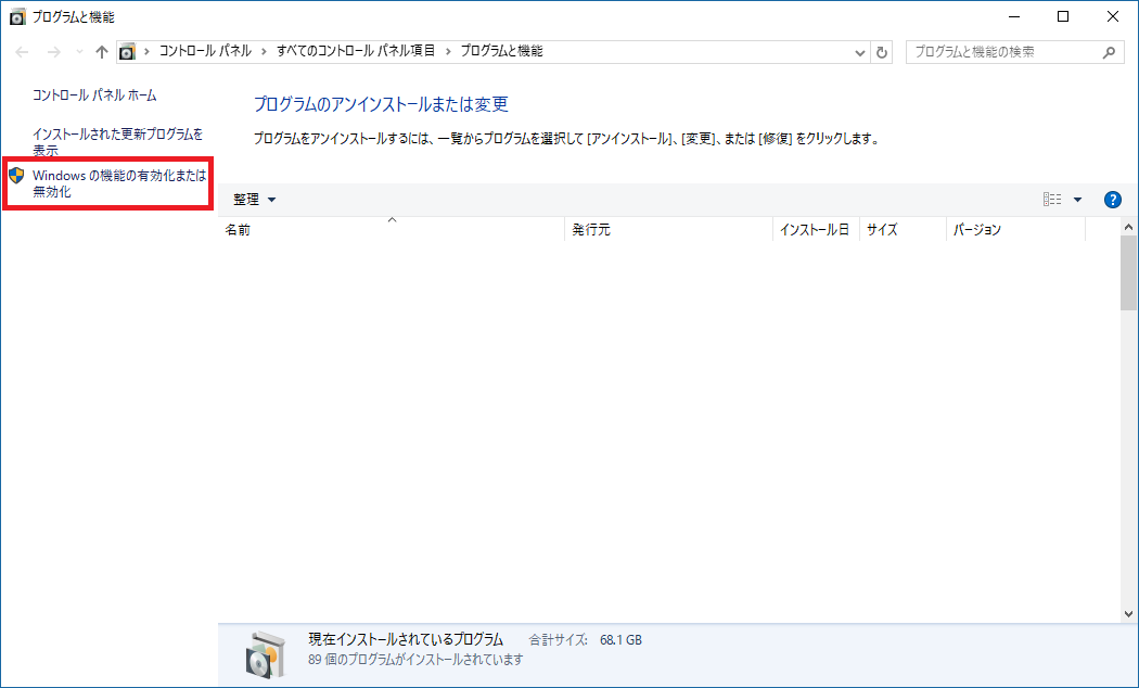 左側の一覧から、Windowsの機能の有効化または無効化をクリックする。