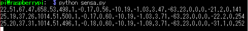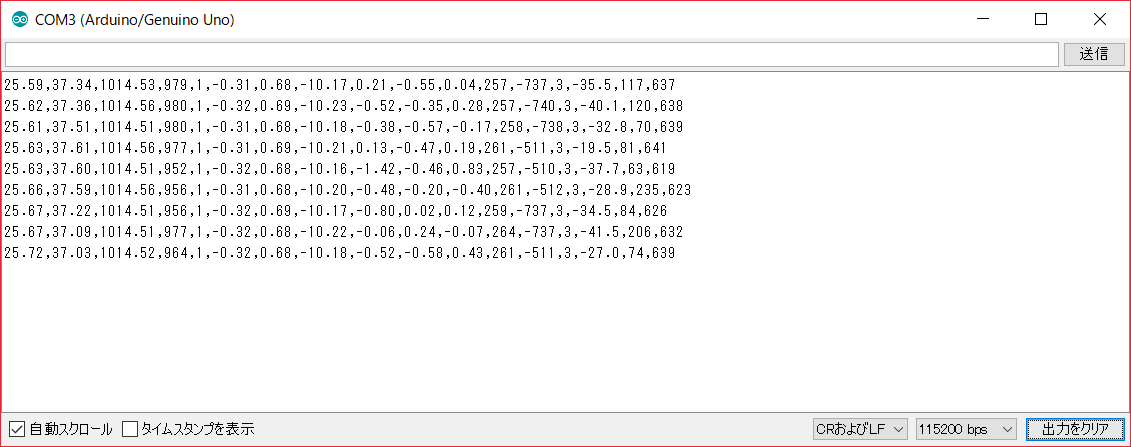 結果はカンマ区切りで表示されていて,左から「気温,湿度,気圧,照度,人感,加速度(3軸),角速度(3軸),磁気コンパス(3軸),体温,脈拍,GSR」である.