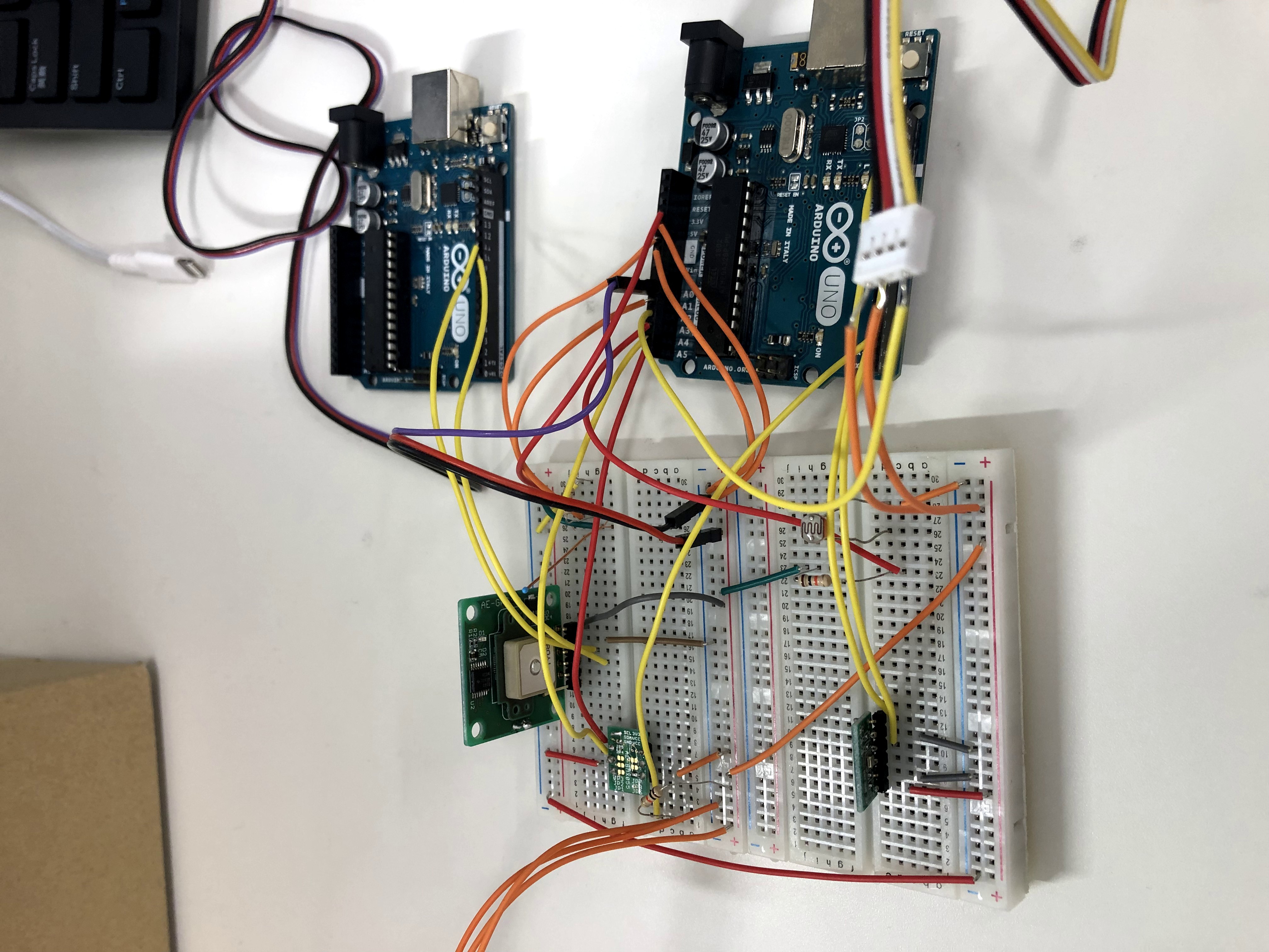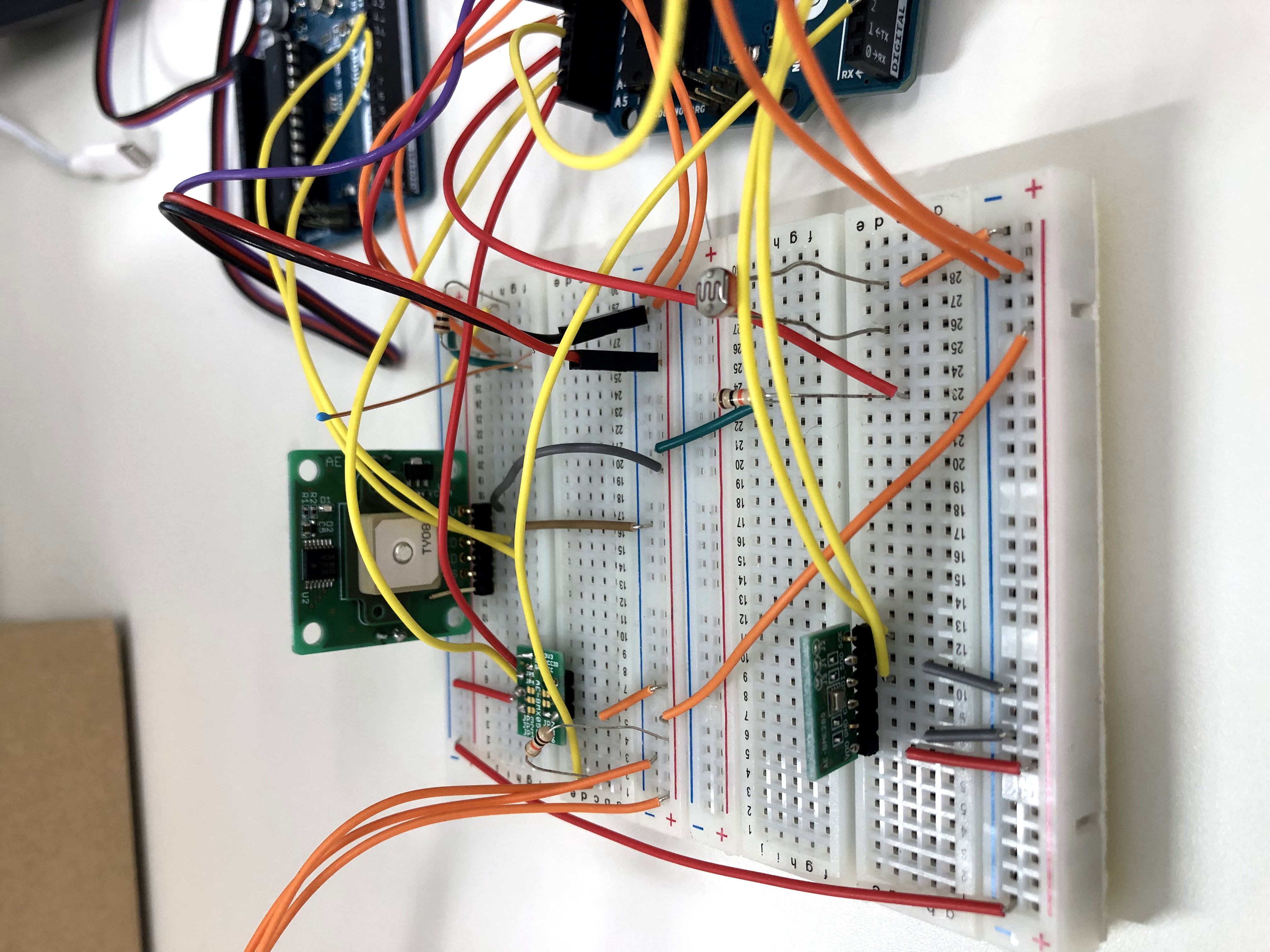 Arduino×2(GPSセンサとその他のセンサを同じArduinoで動かすと衝突してうまく動かないため,GPSだけ別のArduinoで動かす.)