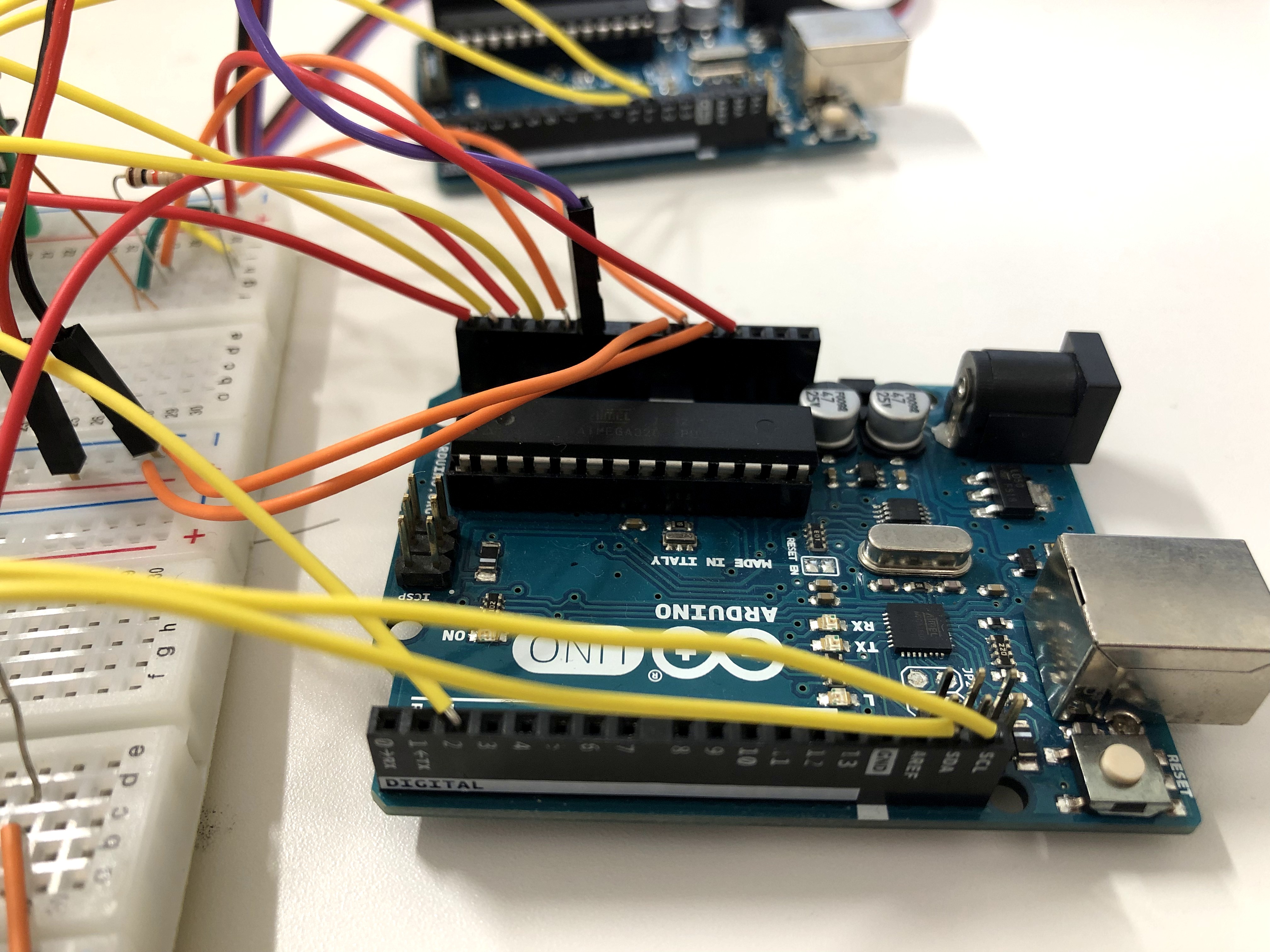 PCとGPSセンサが接続しているArduinoをコードで接続する.例で示した配線と同じように組んだ場合は,基盤の電源は最初のArduinoにつないだコードから供給しているので先ほどのArduinoにつないでいるコードは抜かない.