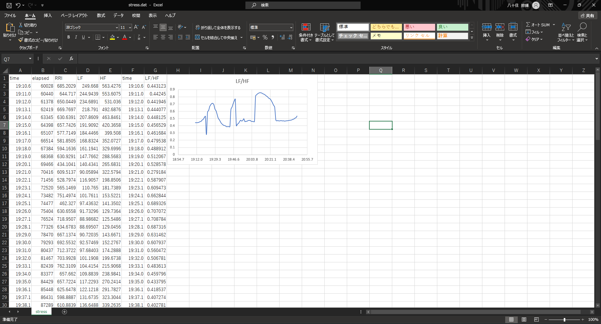 あとはtimeの列とLF/HFの列を下まで選択して挿入→散布図(線だけのやつ)でグラフを作成することができる.