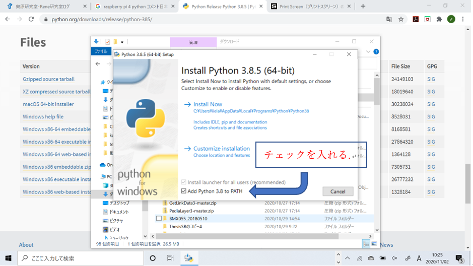 次に,ダウンロードした「python-3.9.0-amd64.exe」を開き,下図のように設定し,「Install Now」をクリックする.(下の図は諸事情により3.8.5になってます)